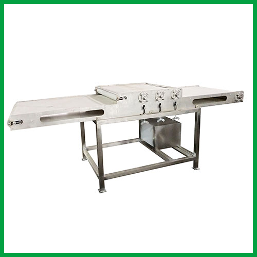 其結構由機架、驅動機構、傳動機構、成形機構等部分組成。魚片直接放入搟片機輸送帶上,在壓輥壓力作用下,通過定做的模板,加工出特定形狀的魚片,外形平整美觀,纖維疏松,吃起來口感綿柔,不粘牙齒。